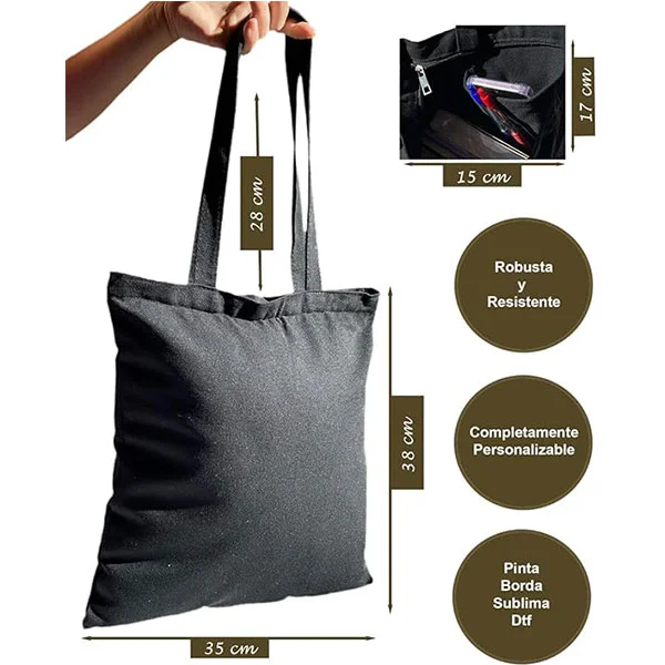 Nuestra bolsa de tela negra con cremallera y bolsillo interior es la combinación perfecta de estilo, funcionalidad y resistencia. Con gran capacidad, es ideal para universidad, compras, gimnasio o trabajo. Fabricada en tela duradera, es reutilizable y personalizable, perfecta para expresar tu creatividad. Si deseas personalizar tu pedido, contáctanos por correo.